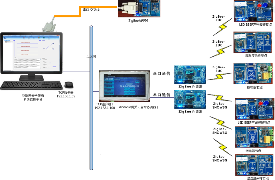 包含2組ZigBee自組網(wǎng)絡。ZigBee傳感器節(jié)點與協(xié)調(diào)器之間可配置為加密數(shù)據(jù)傳輸,加密類型支持ZUC、snow3G、Lblock、kasumi、AES五種輕量級加密算法。ZigBee協(xié)調(diào)器支持白名單入網(wǎng)保障機制,根據(jù)申請入網(wǎng)設備的MAC地址識別并判斷該節(jié)點是否合法,從而做出允許或拒絕入網(wǎng)的動作。Android網(wǎng)關采用TCP協(xié)議與PC服務器通信,實時接收ZigBee協(xié)調(diào)器解密后的傳感層數(shù)據(jù),內(nèi)嵌五種加密類型,支持靈活配置,將傳感層數(shù)據(jù)經(jīng)過解析、重組,加密傳輸至PC端服務器信息平臺。服務器軟件平臺通過捕獲器捕獲傳感網(wǎng)幀,以流程條方式動態(tài)展示傳感層認證步驟,顯示繪制網(wǎng)絡拓撲結構,MAC/NWK/APS數(shù)據(jù)幀詳細數(shù)據(jù),支持五種輕量級算法的加解密,分析數(shù)據(jù)幀的加密類型,統(tǒng)計加密算法的效率、列表顯示設備狀態(tài)、遠程監(jiān)測與控制傳感器設備等。技術架構如圖所示: