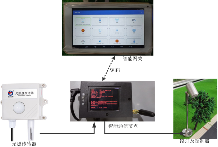 (1)路燈控制系統(tǒng):由智能通信節(jié)點及外圍驅(qū)動電路板、路燈、光照傳感器組成。智能通信節(jié)點實時采集光照度,通過無線通信方式傳輸至網(wǎng)關。結(jié)合網(wǎng)關應用程序,可以實現(xiàn)路燈開關控制、環(huán)境光照度定時采集,設置光照傳感器與路燈控制器的聯(lián)動策略,根據(jù)光照強度,自動控制路燈開關;同時將光照度數(shù)據(jù)、路燈開關狀態(tài)上傳到云平臺進行可視化展示,遠程路燈控制。