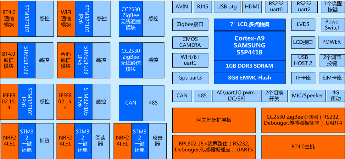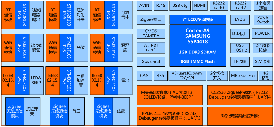 一、整體要求 1)能夠滿足單片機(jī)接口及應(yīng)用、傳感器接口及應(yīng)用、無線傳感網(wǎng)、嵌入式操作系統(tǒng)開發(fā)、嵌入式Linux應(yīng)用開發(fā)、Android移動應(yīng)用開發(fā)等課程要求。 2)能夠組建藍(lán)牙、WiFi、IEEE802.15.4、ZigBee四種無線網(wǎng)絡(luò),實(shí)現(xiàn)數(shù)據(jù)的無線傳輸; 3)能夠?qū)⑺{(lán)牙、WiFi、IEEE802.15.4無線網(wǎng)絡(luò)經(jīng)IPV6協(xié)議、Zigbee節(jié)點(diǎn)經(jīng)ZStack協(xié)議融合在一個拓?fù)鋱D中,在界面上顯示藍(lán)牙、WiFi、RPL802.15.4、ZigBee等節(jié)點(diǎn)的傳感器數(shù)據(jù)或執(zhí)行器狀態(tài),并實(shí)時流動地顯示各個傳感器數(shù)據(jù)的上、下行走向; 4)要求藍(lán)牙、WiFi、IEEE802.15.4三種傳感器節(jié)點(diǎn)均具有唯一的IPv6地址,統(tǒng)一采用IPv6協(xié)議組包通信。 5)要求網(wǎng)關(guān)支持Linux、Android雙操作系統(tǒng),支持一鍵燒寫、一鍵切換。 6)要求在保證網(wǎng)關(guān)接入互聯(lián)網(wǎng)的前提下,能夠配置接入云服務(wù)平臺,并實(shí)現(xiàn)移動端傳感器數(shù)據(jù)的采集顯示和執(zhí)行器的遠(yuǎn)程控制。 二、硬件資源 1.Cortex-A9網(wǎng)關(guān)(1個) 1)核心板資源: (1)CPU:Cortex-A9四核心的Samsung s5p4418,主頻1.4GHz; (2)GPU:MAIL-400,3D圖形加速 (3)內(nèi)存: 1GB DDR3; (4)EMMC: 8GB; (5)核心板+底板設(shè)計:核心板加裝屏蔽罩,郵票孔方式與底板連接,抗干擾能力更強(qiáng),比插針式更穩(wěn)定可靠。要求引出核心板信號線,不少于188PIN。 2)網(wǎng)關(guān)主板資源: (1)LCD接口:7寸IPS電容屏(16:9),分辨率1024×600; (2)USB接口:2路USB_HOST 2.0輸出,1路USB OTG; (3)Ethernet接口:核心板內(nèi)置千兆IP,外加不超過3RMB的PHY芯片即可,支持10/100/1000M,RJ45接口; (4) 串口:2路3線RS232,1路TTL接口,1路RS485,1路Bluetooth; (5)CAN總線接口:1路; (6)RS485總線接口:1路; (7)HDMI 接口:HDMI1.4a,*大支持1920*1080高清數(shù)字輸出; (8)LVDS液晶屏接口:單通道,*大支持1920*1080; (9)攝像頭接口:1路CMOS并行接口,*大支持800萬像素; (10)AV接口:1路模擬視頻母口輸入; (11)外部存儲擴(kuò)展接口:SD卡、TF卡接口; (12)音頻接口: 1路MIC輸入,1路1. 8w喇叭; (13)按鍵:1個復(fù)位按鍵、1個休眠喚醒按鍵,2個音量鍵; (14) 藍(lán)牙WiFi:板載藍(lán)牙WiFi二合一模塊; (15)Mini PCIe接口:標(biāo)準(zhǔn)可插入4G通信模模塊; (16)24Pins應(yīng)用擴(kuò)展接口:用于處理器外設(shè)接口擴(kuò)展功能,包含3路串口、1路PWM、1路IIC、1路ADC、8個GPIO,5V電源。 2.網(wǎng)關(guān)IO基礎(chǔ)擴(kuò)展板(1個) 由網(wǎng)關(guān)直接驅(qū)動。采用HC595串入并出特點(diǎn),使用較少IO擴(kuò)展更多功能,默認(rèn)地址0x01。1路可調(diào)電位器模擬AD采樣通道,1路PWM驅(qū)動的蜂鳴器,5個觸摸按鍵,5個LED指示燈。 3.三路繼電器擴(kuò)展板(1個) 由網(wǎng)關(guān)直接驅(qū)動。采用HC595串入并出特點(diǎn),使用較少IO擴(kuò)展更多功能,默認(rèn)地址0x10。 可控制3路繼電器,線圈機(jī)械式觸點(diǎn),1個常開,1個常閉,*大負(fù)載10A/277V AC。 4. ZigBee協(xié)調(diào)器(1個) 與網(wǎng)關(guān)的TTL UART連接。采用CC2530單片機(jī)外設(shè)接口、射頻通信與ZStack協(xié)議棧的方案,具備Zigbee建網(wǎng)功能,具有2個組網(wǎng)狀態(tài)及無線傳輸指示燈,2個功能按鍵,提供傳感器模塊接口、RS232接口、調(diào)試下載接口。 5. IEEE802.15.4主機(jī)(1個) 與網(wǎng)關(guān)的TTL UART連接。采用CC2530射頻功能與802.15.4的從機(jī)組建射頻網(wǎng)絡(luò),接收從機(jī)信息,向從機(jī)發(fā)送命令。具有2個組網(wǎng)狀態(tài)及無線傳輸指示燈,2個功能按鍵,提供傳感器模塊接口、RS232接口、調(diào)試下載接口。 6.無線傳感網(wǎng)通信節(jié)點(diǎn)(12個) 1)微控制器主板硬件資源 (1)Cortex-M3核心主板(9個) 處理器基于ARM Cortex-M3核心的STM32F103,*高主頻72Mhz,內(nèi)部Flash 256KB,RAM 48KB。 具有1個0.96寸OLED屏,能夠顯示MAC地址、上下級關(guān)系、傳感器數(shù)據(jù)、網(wǎng)絡(luò)信息等。 具有4個組網(wǎng)狀態(tài)及無線傳輸指示燈,2個功能按鍵、1個JTAG調(diào)試接口、1個24PIN的無線射頻接口,1組20*2PIN傳感器接口; 標(biāo)配ARM仿真器、串口下載仿真調(diào)試轉(zhuǎn)接板。 運(yùn)行IPv6協(xié)議棧實(shí)現(xiàn)無線通信的功能。 (2)CC2530核心主板(3個) 處理器基于CC2530F256,具有2個組網(wǎng)狀態(tài)及無線傳輸指示燈,2個功能按鍵、1個JTAG調(diào)試接口、1個24PIN的無線射頻接口,1組20*2PIN傳感器接口; 標(biāo)配下載仿真器。 2)無線傳感網(wǎng)通信模塊 (1)藍(lán)牙通信模塊(3個):采用UART接口的內(nèi)置協(xié)議棧方案,設(shè)置從機(jī)模式,與主機(jī)配對后,將微控制器采樣數(shù)據(jù)傳輸給主機(jī)。 (2)WiFi通信模塊(3個):采用UART接口的內(nèi)置TCP/UDP/HTTP協(xié)議棧方案,支持設(shè)置為AP、STA的工作模式,與網(wǎng)關(guān)通信后,將微控制器采樣數(shù)據(jù)傳送給主機(jī),或者接收主機(jī)的控制命令控制執(zhí)行器。 (3)IEEE802.15.4通信模塊(3個):基于CC2530射頻組網(wǎng)通信方案,與邊界路由器組網(wǎng),實(shí)現(xiàn)傳感器數(shù)據(jù)的雙向交互。 (4)ZigBee通信模塊(3個):基于CC2530+ZStack協(xié)議棧組網(wǎng)通信方案,與Zigbee協(xié)調(diào)器組網(wǎng),實(shí)現(xiàn)傳感器數(shù)據(jù)的雙向交互。 3)傳感器通信模塊(12