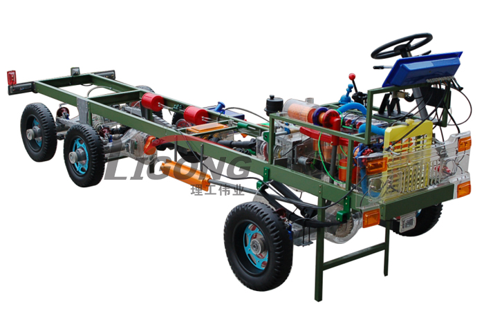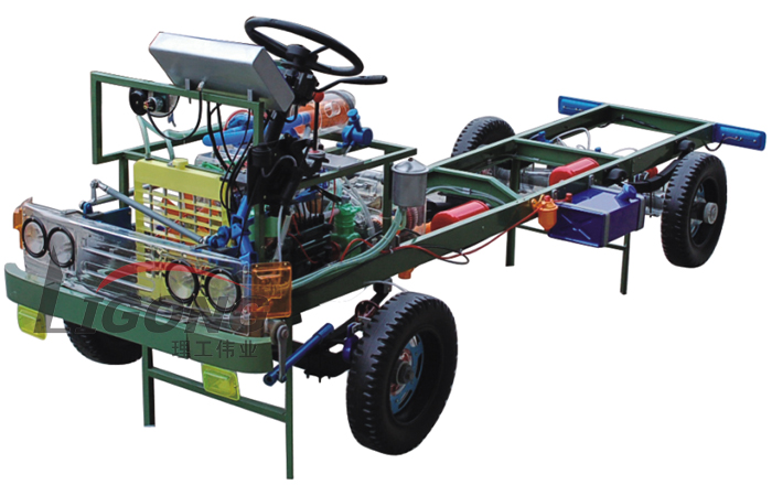本品選用透明有機玻璃制作,內(nèi)中部件均以硬質(zhì)塑料料加工,用 螺絲固定在金屬高溫烘漆而成的車架上。各總成部分都以壓模成形加 工,代替過去膠粘合的方法,使產(chǎn)品在強度上有很大提高。發(fā)動機總成用電機驅(qū)動,在油門處設(shè)有調(diào)速裝置,能演示發(fā)動機轉(zhuǎn)速高低。離合器分離明顯,操縱靈活,離合器外殼整體壓模而成,變速箱和各檔齒輪用各種顏色表示,換檔靈活,手制動美觀。后橋外形壓模而成,內(nèi)中主減速、差速轉(zhuǎn)動自如,輪轂剎蹄壓模成型,剎蹄可調(diào)節(jié),前橋輪鼓可調(diào)整,轉(zhuǎn)向裝置以及電瓶、油箱、水箱,制動管路分布清楚一目了然。電路采用對插件前后分布,燈架、風(fēng)窗、儀表板、后燈架用透明有機玻璃壓模成整體美觀逼真。