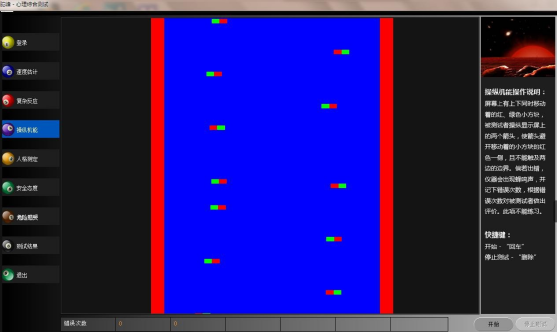 本系統(tǒng)是根據(jù)人的注意力分配習(xí)慣,并應(yīng)用先進(jìn)的計算機(jī)技術(shù)開發(fā)研制的操縱機(jī)能測試儀器。受測者只要按要求轉(zhuǎn)動方向盤,操縱黃色小條便可以完成測試。屏幕上有上下同時移動的紅綠色小方塊,被測試者操縱顯示屏上的兩個箭頭,使箭頭避開移動著的小方塊紅色一側(cè),并且不能觸及兩邊的邊界,尚若出錯,儀器會出現(xiàn)蜂鳴聲,并記下錯誤次數(shù),系統(tǒng)根據(jù)錯誤次數(shù)對被測者做出評價。