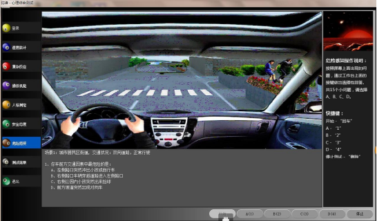 主要能實現(xiàn)速度估計測試、復(fù)雜反應(yīng)判斷測試、操作技能測試、危險感知測試、駕駛員人格測試、駕駛員安全態(tài)度測試、注意力分配與轉(zhuǎn)移測試、深度知覺測試等內(nèi)容。