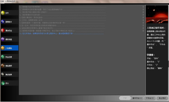 (4)檢查方法: 對屏幕上出現(xiàn)的問題通過工作臺上的數(shù)字選擇鍵(1、的確如此;2、似乎如此;3、不太象;4、的確不是)作出回答。 根據(jù)回答結(jié)果作出評價。