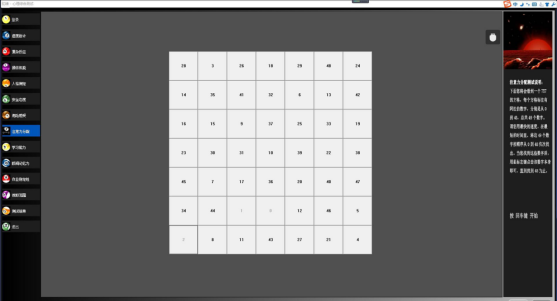開始測試后,屏幕中出現(xiàn) 0-48 個按照 7*7 方格隨機(jī)排列的 49 個數(shù)字,要求受試人由“0”開始,按照從小到大的順序,在方格中依次將 0-48 之間的所有數(shù)字全部找出,找到數(shù)字后點擊鼠標(biāo)左鍵劃掉該數(shù)字。記錄受試者完成的時間。