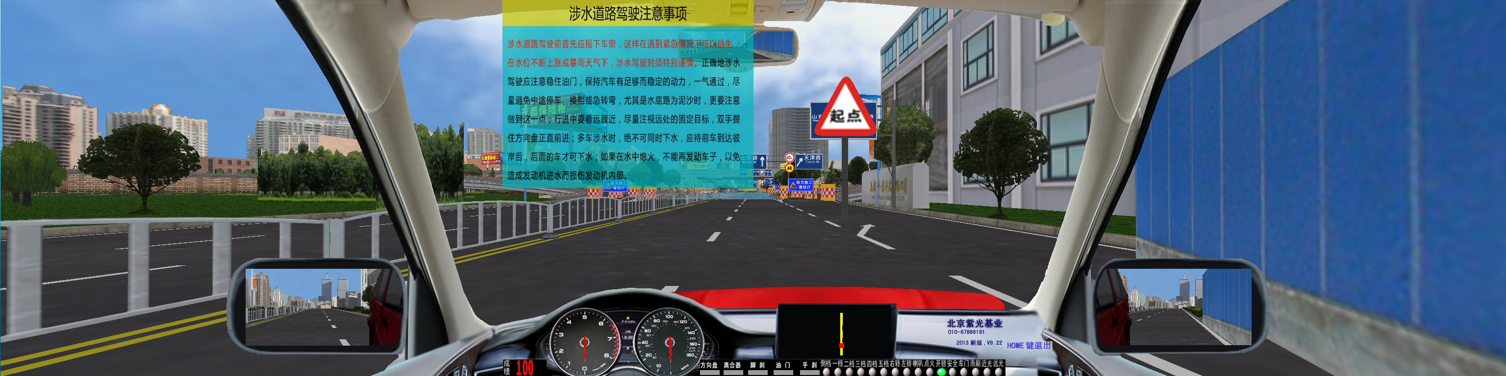 危險(xiǎn)場景:視線不清的交通情況下,超車后突然切入他人道引起被超車輛緊急制動(dòng)、自行車、行人突然橫穿馬路,路面維修,障礙物繞行等 危險(xiǎn)場景、專項(xiàng)駕駛:危險(xiǎn)道路、眩目道路、爆胎體驗(yàn)、緊急避讓、趣味駕駛等駕駛科目。炫目道路:(朝九晚五的太陽)炫目會(huì)車,炫目駕駛鄉(xiāng)村道路等。泥濘道路:泥濘洼地道路駕駛(方向、制動(dòng)、驅(qū)動(dòng)有打滑滯后感)場景模型取鄉(xiāng)村道路,道路變?yōu)槟酀魻顟B(tài)。石子路面:汽車在其上面行駛,遇到剎車時(shí)剎不住車,還可汽車還在繼續(xù)滑動(dòng),有時(shí)還會(huì)斜向滑行,極難控制感,汽車在石子路面里滑動(dòng)。涉水道路:涉水駕駛汽車有水流沖力對(duì)車輛的前進(jìn)阻力感光及側(cè)滑感,輪胎與水下的路壓力減小,驅(qū)動(dòng)力受到限制,使行駛受阻感覺。專項(xiàng)訓(xùn)練:要附合交通部要求。系統(tǒng)評(píng)分:每次駕駛結(jié)束,系統(tǒng)自動(dòng)評(píng)分。山區(qū)到路:突出坡多、彎多、凹凸路面、駕駛環(huán)境復(fù)雜、有側(cè)風(fēng)、有陡坡長坡、溜坡、側(cè)滑(有語音提示)。鄉(xiāng)村道路:含鐵道路口;加油站,公交車站、單行道、農(nóng)田道口等;城市道路:含公交站臺(tái),高架立交橋、公交專用道、十字路口、丁字路口、環(huán)島、隧道、單行道、雙黃線、加油站、商場百貨門口斑馬線天橋,學(xué)校門口及紅綠燈,行人、非機(jī)動(dòng)車亂穿馬路及非機(jī)動(dòng)車等。高速公路:包括收費(fèi)站(入、停、出、)服務(wù)區(qū)、緊急帶、匝道行駛、超車道、行車道、隧道、立交橋、交通標(biāo)牌標(biāo)線。