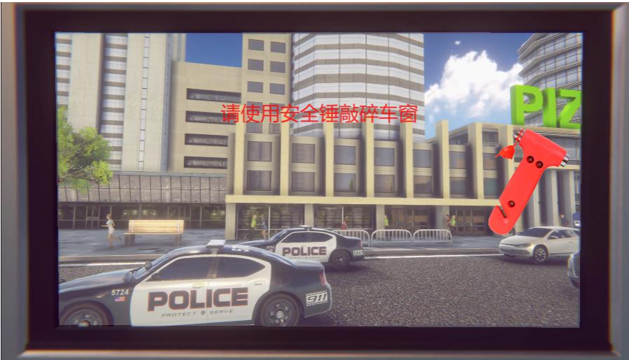 軟件內(nèi)容:模擬一段城市背景道路,有公交車(chē)站臺(tái),大小車(chē)輛,車(chē)輛交匯,行人等,模擬公交車(chē)在街道上行駛,在路口轉(zhuǎn)彎時(shí)配有語(yǔ)音提示“車(chē)輛轉(zhuǎn)彎,請(qǐng)扶好扶手”,車(chē)廂內(nèi)搭載視頻(播報(bào)公交車(chē)相關(guān)逃生畫(huà)面)播放完畢后若干秒,前方道路出現(xiàn)模擬油罐車(chē)迎面相撞,(伴隨車(chē)身較強(qiáng)撞擊感抖動(dòng)),隨后畫(huà)面內(nèi)油罐車(chē)體側(cè)翻著火。然后,模擬車(chē)廂著火后,車(chē)內(nèi)講解引導(dǎo)逃生流程,駕駛員應(yīng)開(kāi)啟車(chē)門(mén),令乘客從車(chē)門(mén)下車(chē)。然后,模擬汽車(chē)車(chē)廂著火,駕駛員打開(kāi)車(chē)門(mén),讓乘客從兩頭車(chē)門(mén)有秩序地下車(chē)。乘客們可用衣物蒙住頭部,從車(chē)門(mén)沖下。模擬車(chē)門(mén)被火燒壞,開(kāi)啟不了,乘客在則面一塊屏上模擬操作安全錘擊打車(chē)窗的模擬操作。車(chē)窗有模擬碎裂感(視頻特效),乘客模擬砸開(kāi)側(cè)面車(chē)窗逃生。體驗(yàn)了上述驚險(xiǎn)過(guò)程,掌握逃生技巧,了解逃生知識(shí),當(dāng)火災(zāi)發(fā)生時(shí)要冷靜處理,科學(xué)逃生。
