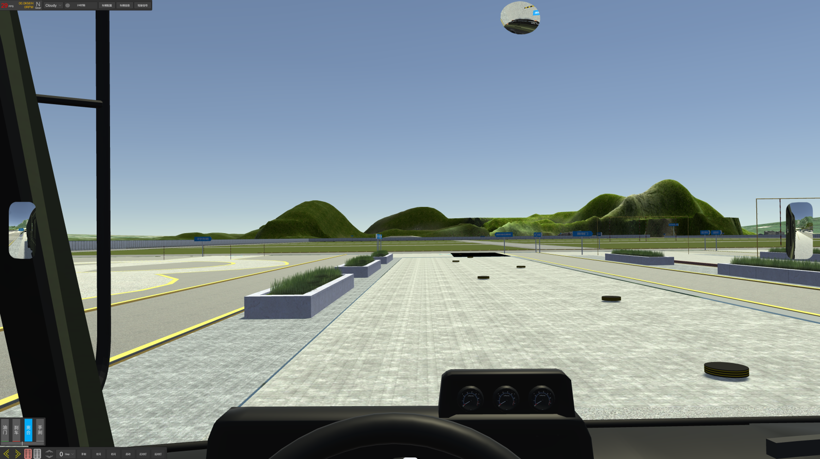 2、軟件主界面:啟動畫面后,界面下方同時顯示:油門、剎車、轉向、離合器深淺進度均有顯示。視景120度全新廣角寬頻駕駛模擬,界面顯示各項指示燈、文字提示框、檔位位置、訓練成績,后視鏡(左、右、中)后視鏡可調節(jié)、訓練線路圖均有顯示。