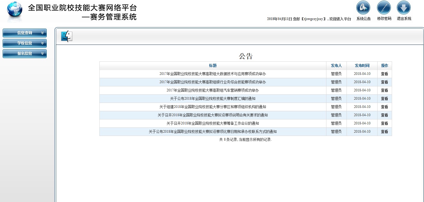 為提高賽務(wù)管理水平,及時(shí)、有效地為參賽師生提供賽會(huì)服務(wù),大賽執(zhí)委會(huì)決定推廣使用全國(guó)職業(yè)院校技能大賽——賽務(wù)管理系統(tǒng),采用網(wǎng)絡(luò)分級(jí)上報(bào)的方式,實(shí)現(xiàn)從選手報(bào)名到成績(jī)匯總的全程管理。該說(shuō)明書(shū)將詳細(xì)介紹賽務(wù)管理系統(tǒng)中為學(xué)校用戶提供的功能。