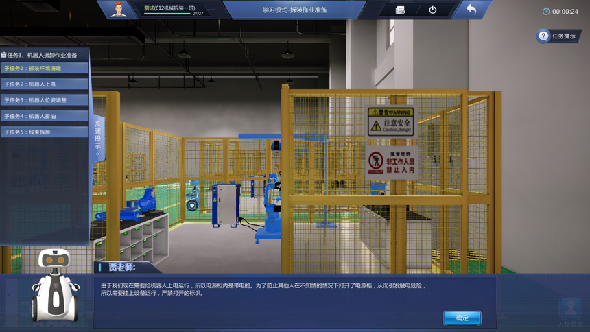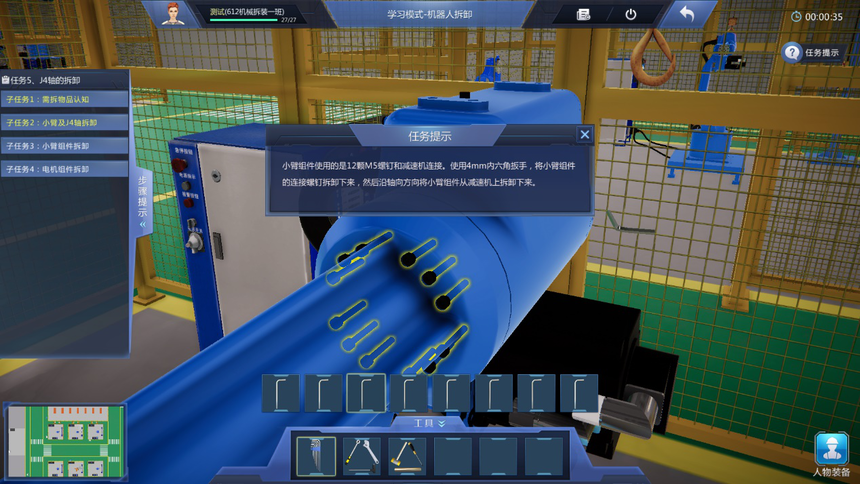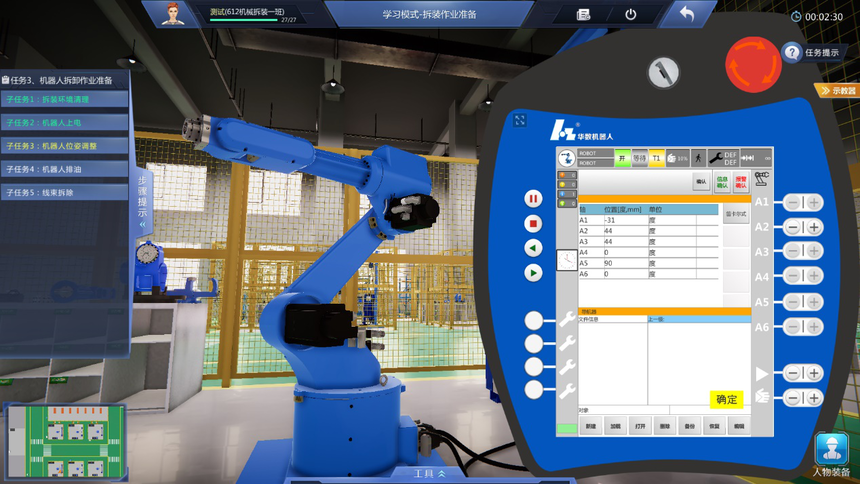 4、學(xué)習(xí)模式教學(xué)實(shí)訓(xùn)任務(wù)豐富:機(jī)器人拆裝作業(yè)準(zhǔn)備虛擬仿真實(shí)訓(xùn)項(xiàng)目包含拆裝作業(yè)防護(hù)準(zhǔn)備、機(jī)器人拆裝工具認(rèn)知、機(jī)器人拆卸作業(yè)準(zhǔn)備等至少3個(gè)教學(xué)實(shí)訓(xùn)任務(wù);機(jī)器人本體拆卸虛擬仿真實(shí)訓(xùn)項(xiàng)目包含機(jī)器人整體拆卸、機(jī)器人J6軸到J1軸的分步拆卸、諧波減速機(jī)的認(rèn)知、RV減速機(jī)的認(rèn)知等至少9個(gè)教學(xué)實(shí)訓(xùn)任務(wù);機(jī)器人本體安裝虛擬仿真實(shí)訓(xùn)項(xiàng)目包含機(jī)器人整體安裝、機(jī)器人J1軸到J6軸的分步安裝、機(jī)器人注油、軸承的認(rèn)知、軸的初步認(rèn)知等至少少10個(gè)教學(xué)實(shí)訓(xùn)任務(wù)。機(jī)器人初步調(diào)試項(xiàng)目包含調(diào)試前準(zhǔn)備、機(jī)器人開機(jī)、機(jī)器人關(guān)機(jī)、機(jī)器人基礎(chǔ)調(diào)試、機(jī)器人精度檢測等至少5個(gè)教學(xué)實(shí)訓(xùn)任務(wù)。