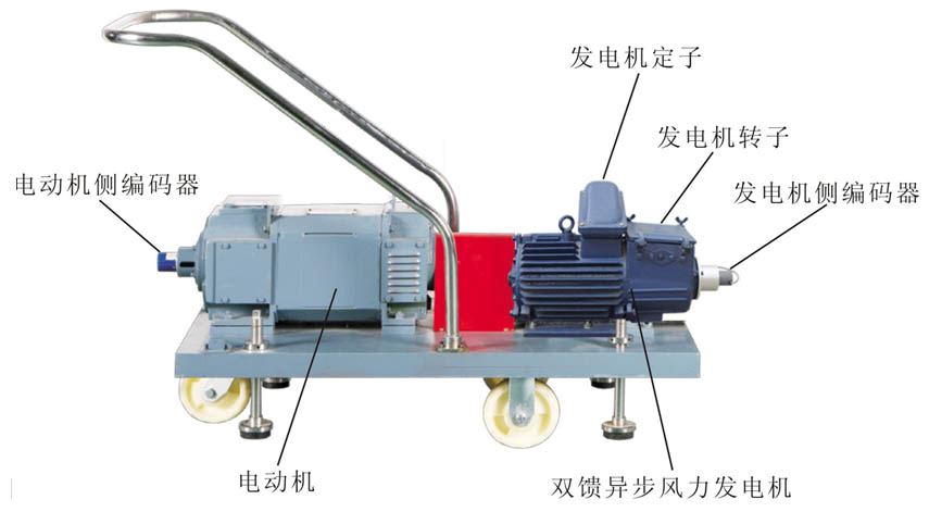 發(fā)電機(jī)組由直流電動機(jī)、雙饋異步風(fēng)力發(fā)電機(jī)、轉(zhuǎn)速傳感器、機(jī)組固定底盤及配套件等構(gòu)成。