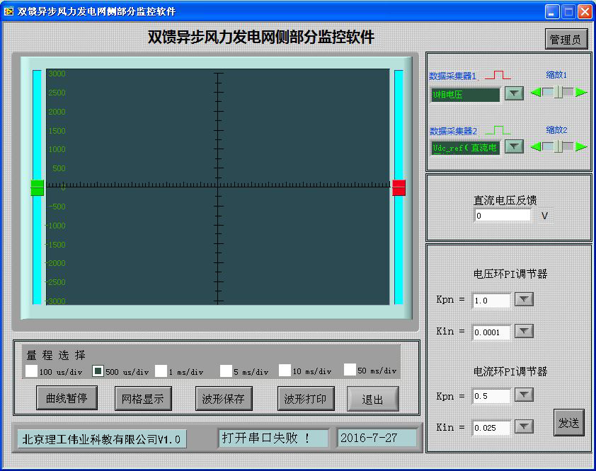 機(jī)側(cè)控制器的作用主要有兩個(gè)方面,一是給雙饋發(fā)電機(jī)的轉(zhuǎn)子提供勵(lì)磁分量的電流,從而可以調(diào)節(jié)雙饋發(fā)電機(jī)的定子側(cè)所發(fā)出的無功功率;二是通過控制雙饋發(fā)電機(jī)轉(zhuǎn)子轉(zhuǎn)矩分量的電流控制發(fā)電機(jī)的轉(zhuǎn)速或控制發(fā)電機(jī)定子側(cè)所發(fā)出的有功功率,從而使發(fā)電機(jī)運(yùn)行在風(fēng)力機(jī)的*佳功率曲線上,實(shí)現(xiàn)*大風(fēng)能追蹤(捕獲)運(yùn)行。機(jī)側(cè)控制器面板安裝有兩個(gè)信號指示燈,16鍵PVC軟鍵盤,240*128點(diǎn)蘭色液晶屏及9個(gè)波形測試端子。信號指示燈可對控制器工作、保護(hù)狀態(tài)分別指示;鍵盤可完成機(jī)側(cè)控制器啟動/停止設(shè)置,*大功率啟動/停止跟蹤設(shè)置,有功/無功給定,手動并網(wǎng)/離網(wǎng);液晶屏可顯示轉(zhuǎn)速反饋值,有功/無功反饋值;波形測試端子可通過示波器觀測發(fā)電機(jī)機(jī)轉(zhuǎn)子、定子相電流波形,可觀測發(fā)電機(jī)定子相電壓、電網(wǎng)相電壓波形。