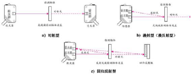 按照接收器接收光的方式的不同,光電式接近開關可分為對射式、反射式和漫射式3種,如圖2-16所示。