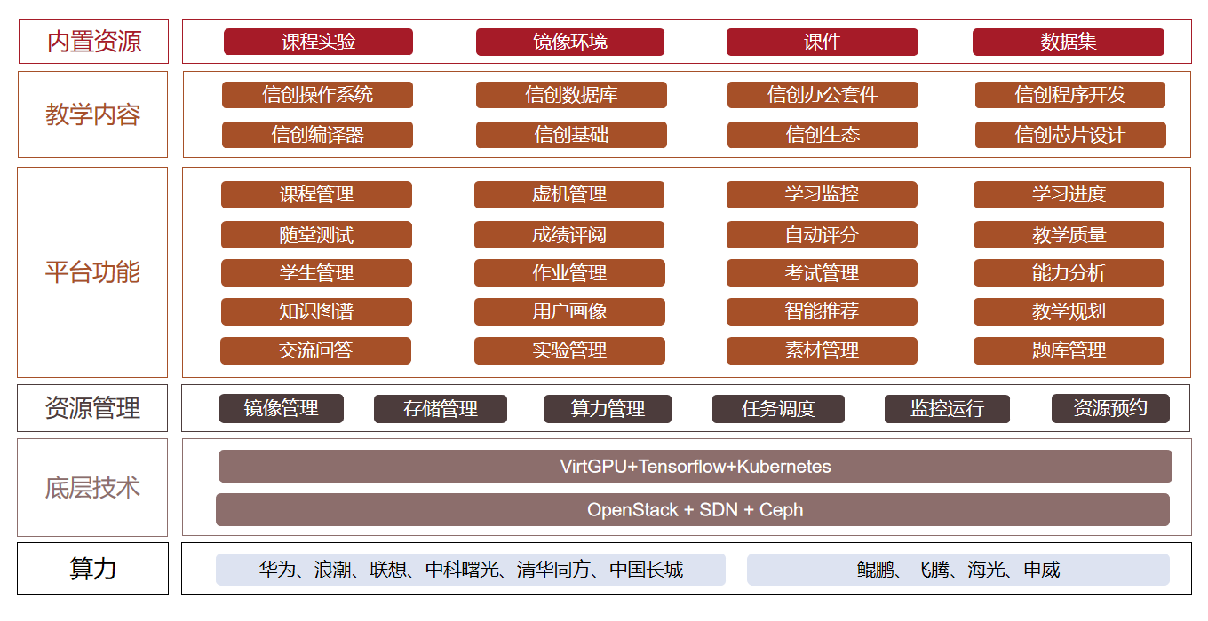 一、建設(shè)方案 高校信創(chuàng)實(shí)驗(yàn)室主要包括數(shù)智化實(shí)踐教學(xué)平臺(tái)和信創(chuàng)課程資源。 數(shù)智化實(shí)踐教學(xué)平臺(tái)采用國產(chǎn)化技術(shù),實(shí)現(xiàn)云計(jì)算資源的集中共享、統(tǒng)一調(diào)度管理的技術(shù)創(chuàng)...