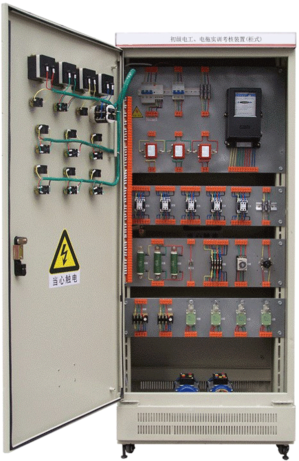 該裝置按標(biāo)準(zhǔn)電氣控制柜設(shè)計制造規(guī)格,充分利用雙面位置,柜內(nèi)裝有完成各種照明電路所需的單相電度表、日光燈、單聯(lián)開關(guān)、插座、感應(yīng)開關(guān)、漏電開關(guān)等,以及電氣控制所需要的多種低壓電器,如漏電斷路器、熔斷器、電流互感器、交流接觸器、時間繼電器、熱繼電器、中間繼電器、行程開關(guān)、按鈕、信號燈、轉(zhuǎn)換開關(guān)、電壓表、電流表、功率表及電度表等,為了延長電器使用壽命,各電器的接點都與接線端子相連,再由接線端子與被控制電氣連接。