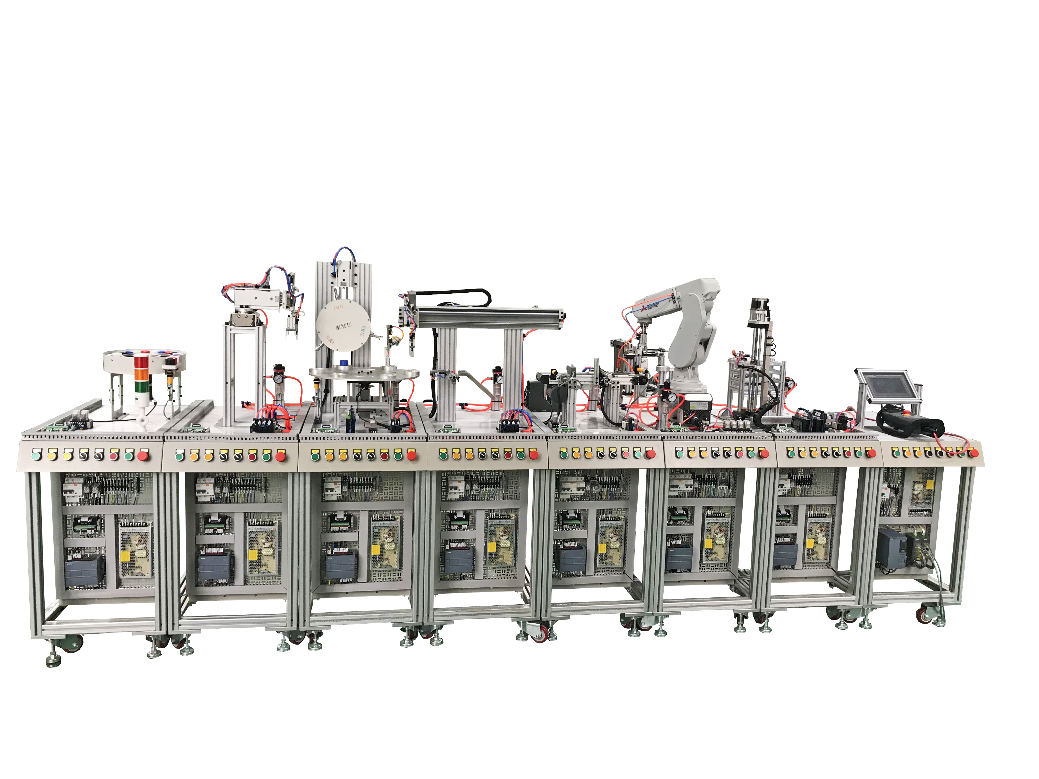 LG-MPS03型 柔性自動化生產(chǎn)線及工業(yè)機器人應(yīng)用實訓(xùn)系統(tǒng)是一種*為典型的機電一體化、自動化類產(chǎn)品,它是為職業(yè)院校、教育培訓(xùn)機構(gòu)等而研制的,它適合機械制造及其自動化、機電一體化、電氣工程及自動化、控制工程、測控技術(shù)、計算機控制、自動化控制等相關(guān)專業(yè)的教學(xué)和培訓(xùn)。它接近工業(yè)生產(chǎn)制造現(xiàn)場基礎(chǔ)上雙針對實訓(xùn)教學(xué)進行了專門設(shè)計,強化了各種控制和工程實踐能力。系統(tǒng)包含了機電一體化專業(yè)中的氣動、電機驅(qū)動與控制、PLC、變頻器、觸摸屏、傳感器等多種控制技術(shù),適合相關(guān)專業(yè)學(xué)生進行工程實踐、課程設(shè)計及初上崗位的工程技術(shù)人員進行培訓(xùn)。
