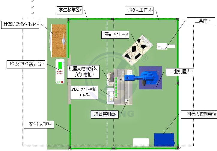 LGH-JR12型 工業(yè)機(jī)器人綜合教學(xué)實(shí)訓(xùn)平臺(tái)整體占地尺寸為 4000mm*4000mm*1500mm(詳見(jiàn)下圖)。工作站含 LG-ZN612型工業(yè)機(jī)器人及其控制柜 1 套、基礎(chǔ)實(shí)訓(xùn)臺(tái) 1 套、綜合實(shí)訓(xùn)臺(tái) 1 套、IO 及 PLC 操作臺(tái) 1 套、安全防護(hù)設(shè)施 1 套、電腦及電腦桌椅(選配)等。