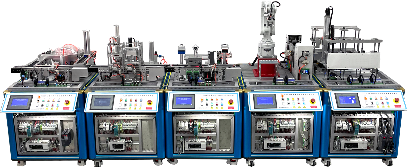 尺寸約:800mm×1040mm×1250mm PLC:FX5U-64MR/ES或 H3U-3232MR 1個 觸摸屏:TPC7062Ti 1臺 傳感器:光電/光纖 12個 氣缸:單桿 4個 電磁閥:DC24V單電控 4個 15針端子接口板 3個 37針端子接口板 1個 直流電機控制板 2個 檢測機構(gòu) 1套 分揀機構(gòu) 1套 輸送帶機構(gòu) 2條 RFID機構(gòu) 1套 視覺檢測機構(gòu) 1套 按鈕操作面板 1套 控制掛板 1套 工作實訓臺 1套 |