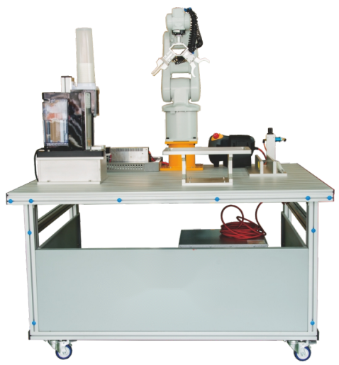 該裝置采用鋁木結(jié)構(gòu)試訓(xùn)臺(tái),由實(shí)訓(xùn)桌、飲水機(jī)(自動(dòng)售賣(mài)機(jī))、取杯器、工業(yè)機(jī)器人(帶復(fù)合手爪),底座(支架)等幾個(gè)部分組成,利用工業(yè)機(jī)器人完成茶藝流程一系列的動(dòng)作。該設(shè)備圍繞工業(yè)機(jī)器人展開(kāi)內(nèi)容,從通訊、機(jī)械、電氣三方面突出顯示其在服務(wù)業(yè)中的運(yùn)用,為學(xué)習(xí)自動(dòng)化提供全面教學(xué)便利。