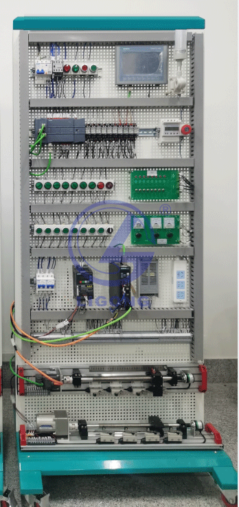 4、電氣控制實(shí)訓(xùn)板上主要硬件有:空氣開關(guān)、變頻器、伺服驅(qū)動(dòng)器、電源保護(hù)及操作按鈕和指示燈、PLC、觸摸屏、24VDC 50W開關(guān)電源、模擬量輸出驅(qū)動(dòng)調(diào)壓模塊等控制器件。