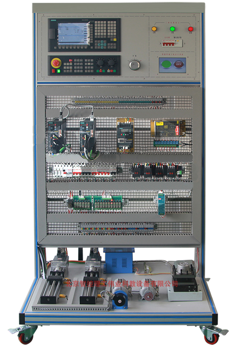(1)電氣控制平臺采用鋁合金型材、網(wǎng)孔板開放式設(shè)計,立式結(jié)構(gòu),符合真實的數(shù)控電氣安裝環(huán)境,主要由數(shù)控系統(tǒng)、進給驅(qū)動、主軸單元、PMC單元、刀架控制電路、冷卻控制電路、接口單元、保護電路、電源電路等組成。該單元包含完整的數(shù)控車床電氣控制部分,以及接口轉(zhuǎn)換單元。