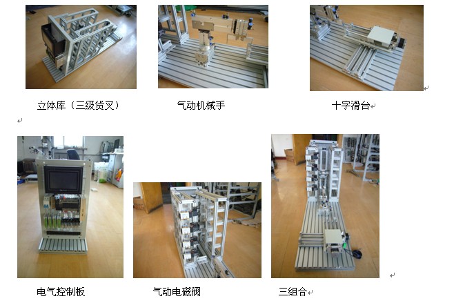 LGZH-02 柔性三組合機(jī)電一體化創(chuàng)新模型實(shí)現(xiàn)動(dòng)作為:首先立體庫(kù)堆垛機(jī)具有水平垂直運(yùn)動(dòng),由步進(jìn)電機(jī)拖動(dòng),帶動(dòng)貨叉,進(jìn)行貨物存取,貨叉為三級(jí)機(jī)械傳動(dòng)。氣動(dòng)機(jī)械手可實(shí)現(xiàn)手爪抓取,提升,轉(zhuǎn)半圈,放下,松開(kāi)手爪。十字滑臺(tái)可走出四角上一周的四個(gè)位置,上方裝有筆架,可以繪圖寫(xiě)字,上方還裝有接近開(kāi)關(guān)和顏色開(kāi)關(guān)及支架,可對(duì)滑臺(tái)上的物體進(jìn)行識(shí)別。