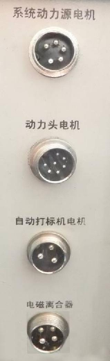 (1)動力系統(tǒng)接口單元操作面板主要由四個開爾文插座組成,從上到下依次為五芯、七芯、 三芯和四芯插座。分別用于連接系統(tǒng)動力源電機、動力頭電機、自動打標機電機(含急停按鈕)、 電磁離合器(含限位開關(guān))。