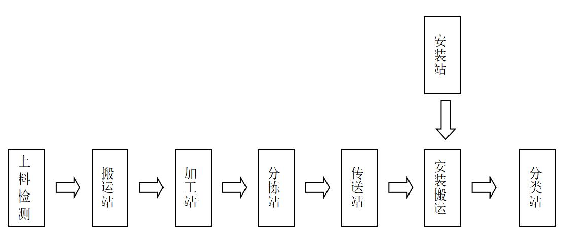下圖給出了系統(tǒng)中工件從一站到另一站的物流傳遞過程:上料檢測單元將大工件按順序排好后提升送出;搬運站將大工件從上料檢測單元搬至加工站;加工站將大工件加工后送出工位;分揀站將加工過的正常的工件搬運到傳送站,如果是廢料,分揀機械手將工件搬運到廢料處理機構;傳輸站將正常的大工件送至尾端,將廢料分揀到廢料槽里;安裝搬運站將大工件從傳輸站搬至安裝工位放下。安裝站再將對應的小工件裝入大工件中。而后,安裝搬運站再將安裝好的工件送分類站,分類站再將工件送入相應的料倉。