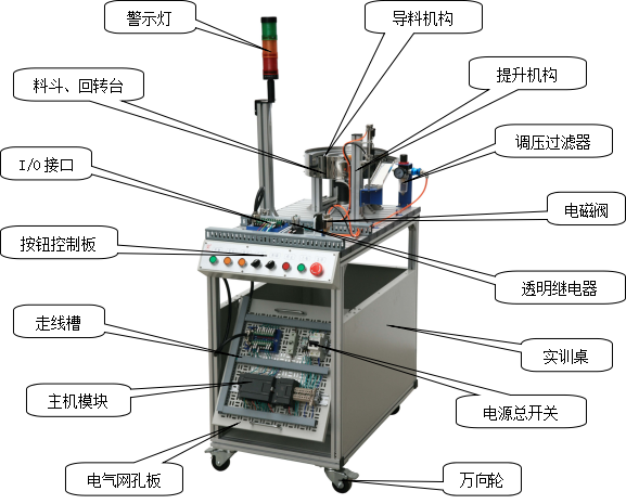 由料斗、回轉臺、導料機構、平面推力軸承、工件滑道、提升裝置、檢測工件和顏色識別光電開關、開關電源、可編程序控制器、按鈕、I/O接口板、通訊接口板、電氣網(wǎng)孔板、直流減速電機、電磁閥及氣缸組成,主要完成將工件從回傳上料臺依次送到檢測工位,提升裝置將工件提升并檢測工件顏色。