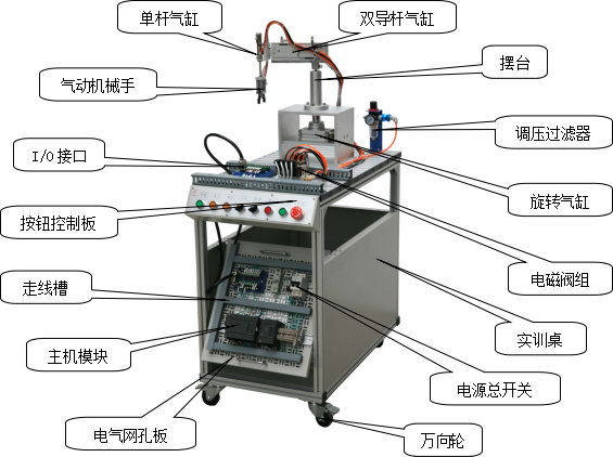 該系統(tǒng)上使用了大量的氣動元件,包括多種電控氣動閥、多種氣動缸、氣動夾爪、真空吸盤、真空發(fā)生器、過濾減速閥等。在學習這些氣動元件時,不但可以單獨學習每一種分離元件,而且還可以在學習時了解各種氣動元件之間,以及氣動元件與其它元件之間,如何配合起來并協(xié)調(diào)進行工作的。