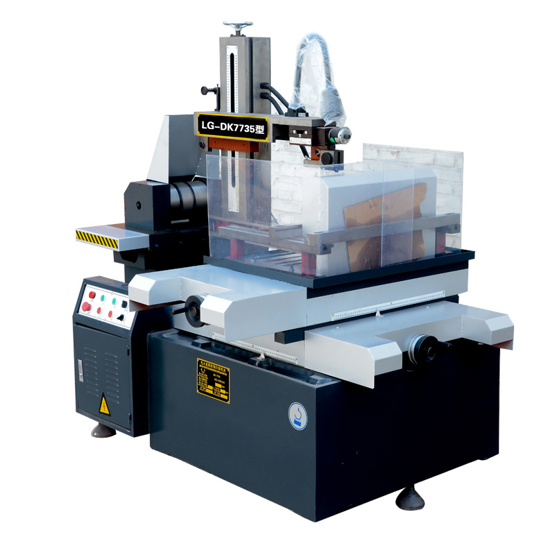 LG-DK7735型 數(shù)控線切割機床可用于加工點、直線、圓弧組成的各種復(fù)雜形狀的金屬零件,本機床采用鉬絲作為工具,電極在高頻脈沖電壓作用下,利用液體介質(zhì)被擊穿后形成火花放電時,在火花通道中瞬間產(chǎn)生大量的熱量,使工件表面的金屬部溶化甚至氣化,使金屬被蝕除下來。本機床操作簡便,加工效率高,穩(wěn)定可靠,經(jīng)濟耐用,可廣泛用于儀器、儀表、汽車行業(yè)模具制造,加工各種沖模、靠模、樣板及異形零件。