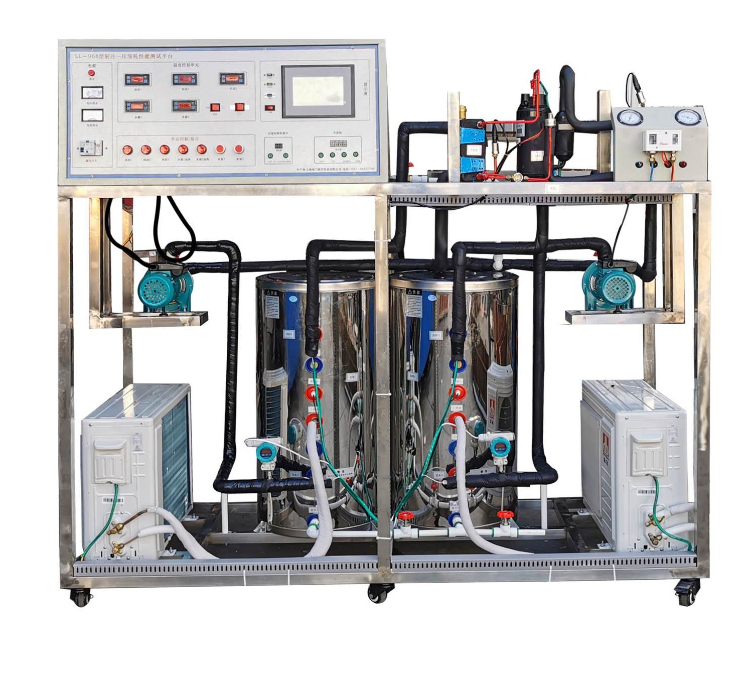 LGZL-RB01型 熱泵-壓縮機(jī)性能實(shí)驗(yàn)系統(tǒng)采用熱平衡法測量熱泵與制冷壓縮機(jī)的性能。系統(tǒng)主要由制冷壓縮機(jī)、蒸發(fā)器、冷凝器、恒溫水箱和電子膨脹閥等組成。采用傳感器和檢測儀表采集蒸汽壓縮式制冷循環(huán)過程中的溫度、壓力、流量、壓縮機(jī)功率、電流、頻率等狀態(tài)參數(shù),經(jīng)自行研制的數(shù)據(jù)采集板卡連接到計(jì)算機(jī),基于面向?qū)ο蠹夹g(shù)開發(fā)的具有實(shí)時(shí)性高,界面設(shè)計(jì)人性化等特點(diǎn)的測控軟件實(shí)現(xiàn)熱力循環(huán)過程實(shí)時(shí)動(dòng)態(tài)顯示、性能參數(shù)測試和計(jì)算,構(gòu)成具有檢測、分析、記錄、測試、繪圖等多功能一體化的熱泵-壓縮機(jī)性能實(shí)驗(yàn)系統(tǒng)?;诨A(chǔ)型機(jī)組,增加如下內(nèi)容:學(xué)生設(shè)計(jì)型與創(chuàng)新型實(shí)驗(yàn)。