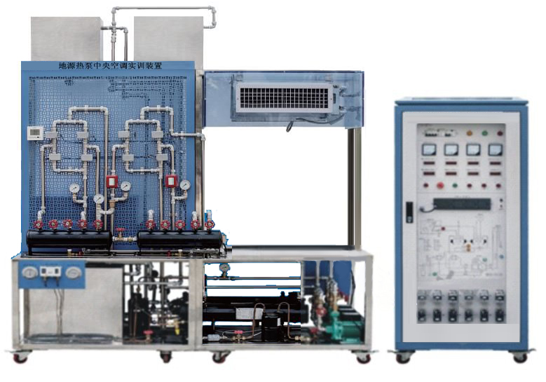 地源熱泵空調(diào)系統(tǒng)由制冷機(jī)組、模擬水井、空調(diào)系統(tǒng)、生活衛(wèi)生供水系統(tǒng)、控制系統(tǒng)、實(shí)訓(xùn)臺(tái)等組成。實(shí)訓(xùn)臺(tái)采用不銹鋼底架結(jié)構(gòu),結(jié)構(gòu)堅(jiān)固,造型美觀大方;桌面用于安裝電源控制屏并提供一個(gè)寬敞舒適的工作臺(tái)面。
