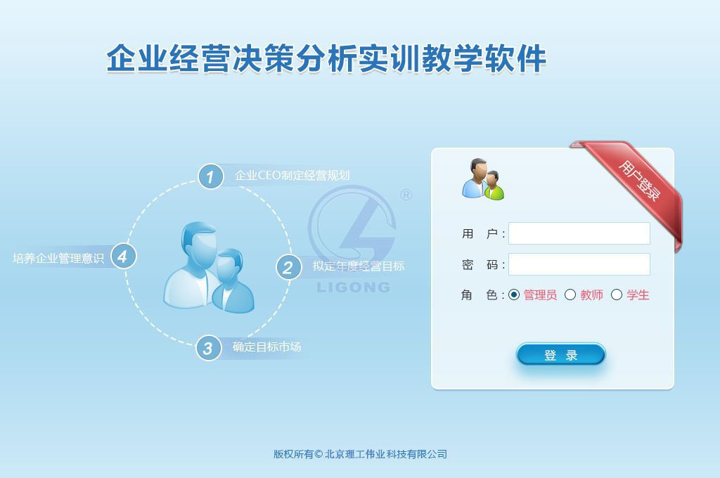 《理工經(jīng)營決策分析實訓(xùn)軟件》件注重培養(yǎng)和提升學生企業(yè)管理意識,構(gòu)建虛擬的企業(yè)運營環(huán)境,讓學生體驗企業(yè)CEO制定經(jīng)營規(guī)劃、擬定年度經(jīng)營目標、確定目標市場、行業(yè)競爭等工作。