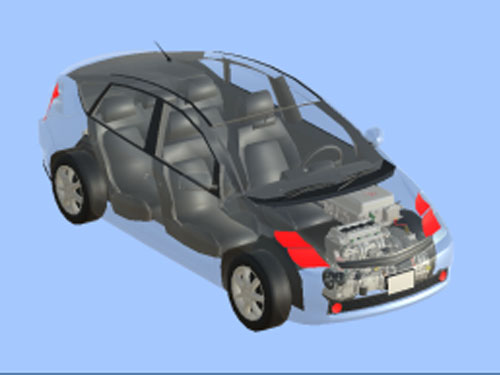普銳斯混合動(dòng)力仿真軟件可在3D環(huán)境下展示混合動(dòng)力系統(tǒng)主要零部件的安裝位置及對(duì)應(yīng)關(guān)系,車(chē)殼采用透明模式,可通過(guò)鼠標(biāo)進(jìn)行360度自由旋轉(zhuǎn);