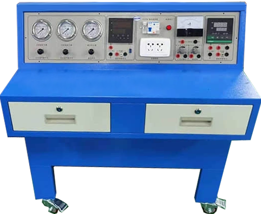 (1)鋼質(zhì)、臺面不小于1500×700mm,后側(cè)置高于臺面300mm左右的斜面,便于布置各種輔助儀表等設備,包括0~0.1MPa壓力表,4~20mA電流表,0.7MPa的氣源壓力表,24VDC100W模塊。臺內(nèi)置模塊的抽屜,方便替換和放置。4個腳安裝帶制動的萬向滑輪,便于實驗臺移動。