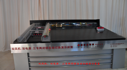 該雙風(fēng)機(jī)、雙電源、自動(dòng)切換,三專二閉鎖演示裝置(適合于一、二、三、四級),通過聲光機(jī)械控制技術(shù),顯示出了井下局部通風(fēng)機(jī)雙風(fēng)機(jī)、雙電源、自動(dòng)切換、三專二閉鎖系統(tǒng)的布置,運(yùn)行方式。