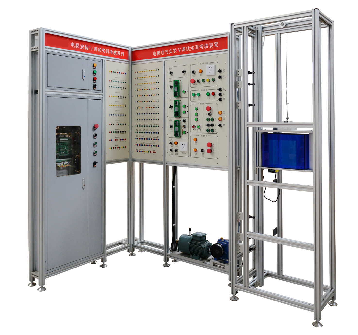 1、電梯電氣安裝調(diào)試實訓(xùn)考核裝置采用了“L”形支架結(jié)構(gòu)能夠減少占地面積,同時多臺并排布置時能夠形成實訓(xùn)室工位式布局;