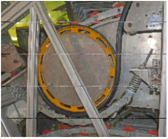 防逆轉(zhuǎn)裝置如下圖,裝置裝在扶梯上部驅(qū)動位。在扶梯上行時凸輪順時針轉(zhuǎn)動,若扶梯發(fā)生異常情況而逆轉(zhuǎn)則凸輪逆轉(zhuǎn),此時打桿使限位開關(guān)動作并使扶梯主剎動作從而使扶梯停止,反之亦然。同時此功能具備手動測試操作功能。