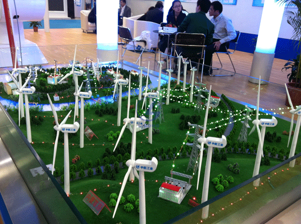 風(fēng)電場模擬動(dòng)態(tài)沙盤:大型風(fēng)電場布局比例設(shè)計(jì);模型整體布局為沙盤式,沙盤上布局20個(gè)小型風(fēng)力發(fā)電機(jī)模型,各風(fēng)機(jī)布局為錯(cuò)開式布置。風(fēng)機(jī)電動(dòng)演示,設(shè)置升壓站,輸電鐵塔、辦公樓等設(shè)施風(fēng)機(jī)、升壓站、輸電線路、場區(qū)環(huán)境,風(fēng)機(jī)電動(dòng)演示;