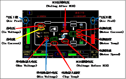 48V電動(dòng)汽車儀表帶CAN通訊; 包含指示燈、電流電壓指示、電量指示、能量流程圖、REDAY/OK燈; |