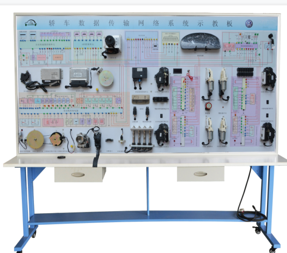 3、系統(tǒng)正常工作,各電器零部件布置在示教板上,在示教板上繪制了CAN總線的線路圖,上面布置了4mm的測量端子;