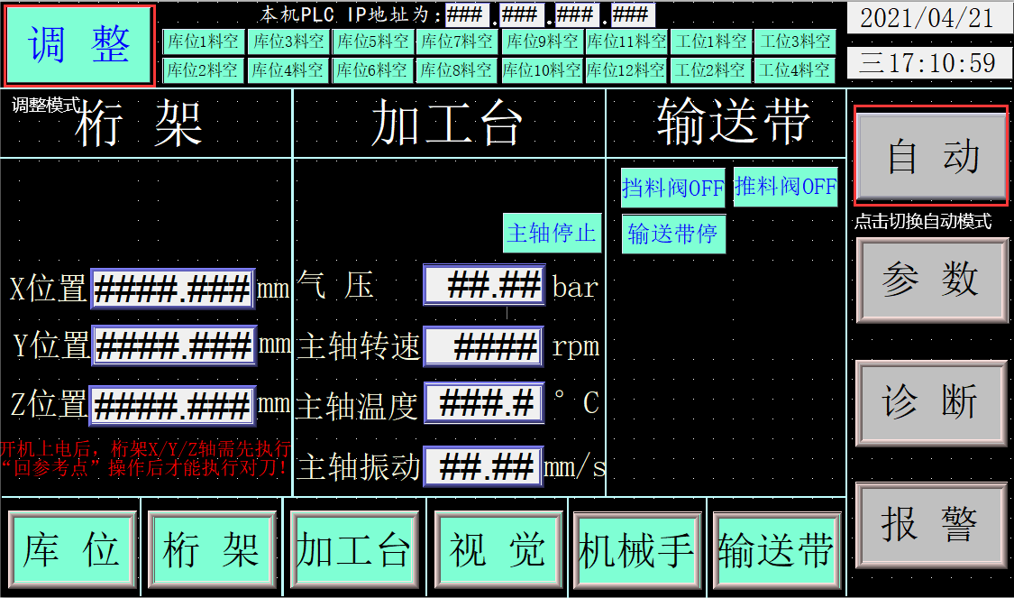 7.設備運行狀態(tài)監(jiān)測:網(wǎng)關(guān)實時讀取堆垛機、加工臺、機械手、傳送帶等設備的運行狀態(tài)及加工主軸的轉(zhuǎn)速、溫度、振動,氣缸壓力等參數(shù),并顯示,同時上傳到平臺。