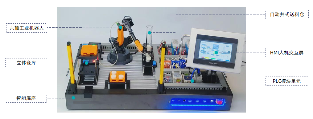 LG-JQRSX型 機器人PLC實訓工作站由桌面級工業(yè)六軸機器人、自動井式出料機、PLC控制模塊、立體倉儲單元及HMI人機交互單元組成。