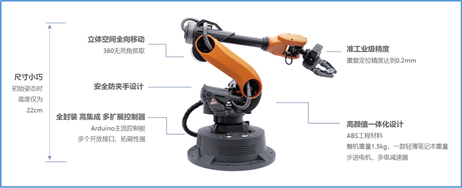 1、六軸桌面機(jī)械臂(含電源、USB接線、IDC通訊線、機(jī)械夾爪、筆夾、多功能控制器、使用說(shuō)明書)×1